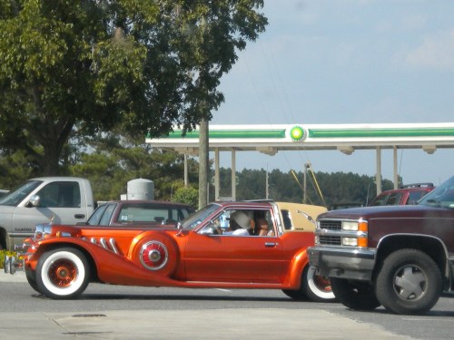 LOL! you did find something to say, my friend! Yep, it’s a rigged up Rolls. AND yeah, orange is such an awesome color to paint your car- it’ll blend right in! HAHHAHA Saw this at a gas station the other side of Tallahassee. Dude driving it had on a white suit and top hat. Woman was all dolled up, too.