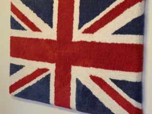The apartment where we  stayed in London had a Union Jack framed over the table. We decided it was a bath mat that the owner had stapled to a wood frame. It has the texture of such a mat. Here’s a photo:
