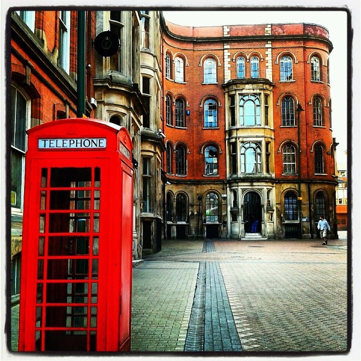 I love the red phone booths. 🙂 The border of the pic is pretty cool. Is it the black backing of an older style photo album or some digital border?