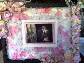 You cracked me up, Laurie. It’s actually a picture frame I made with paper flowers and beads. It’s a picture of my son and fiance in sepia tone. It has flower petals in the part where the matte goes and lace, flowers and beads in the sides.