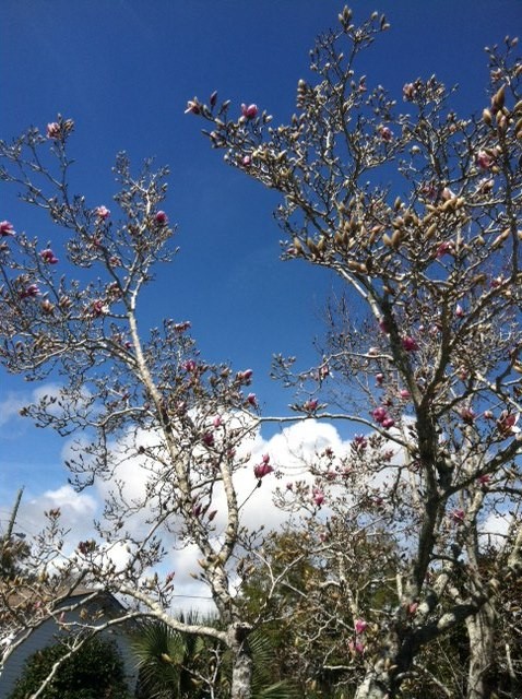 This is in the yard at the office. Japanese magnolia. And yep, blooming now. I love it. Top pic was yesterday at lunch. Bottom is this morning.