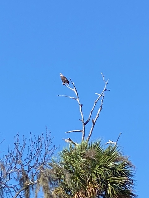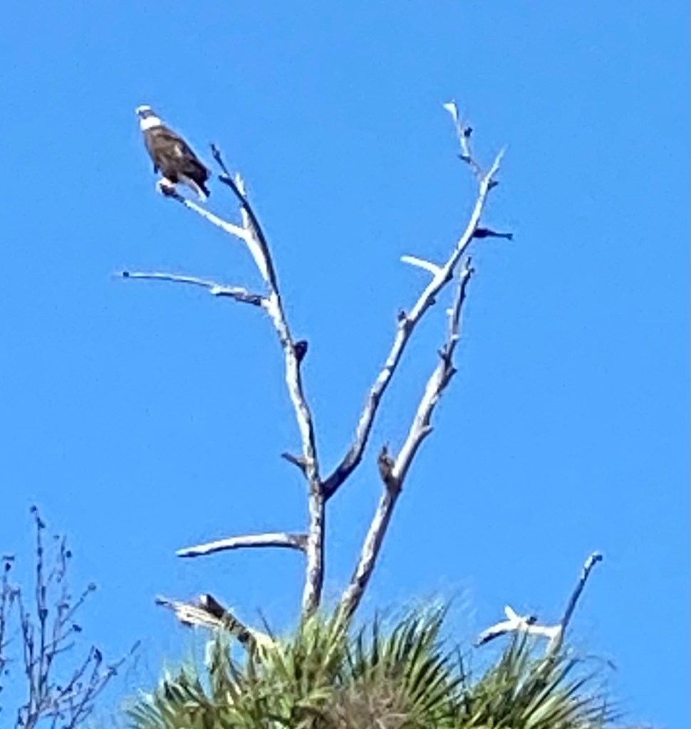 I didn’t see this one. They are pretty rare here. #1 Son and Hubs went fishing on the St Johns River (about 5 hours from where we live) and son snapped the pic. We’re more likely to have herons and pelicans in the road or flying around. I had to dodge a heron standing in the highway back in March. Scared me to death. So nonchalant. LOL  Nesting eagles sounds lovely. Little babies…. I love red-tail hawks. and crows….they love to harass. We get them here, harassing the cats. HA!Â