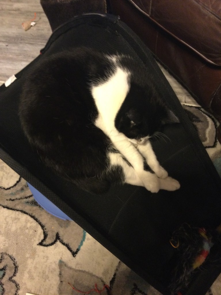 hahahah. I love it when you won’t guess- duck butt anyone??? LOL-  This is a video game chair (upside down) my kids had that Hobbes usually uses as a fort, hiding under it. This week, he decided to cram himself into that crazy spot and has been snoozing there the last three nights. Weirdo!Â