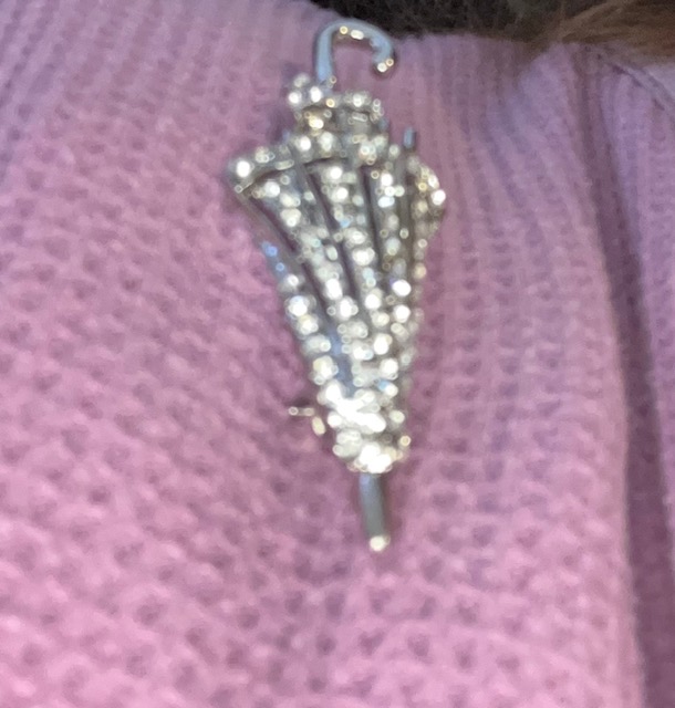 What a lovely broach. However, I’d say the umbrella motif is a little more suited to my neck of the woods than yours. Though you do get some torrential rains, so maybe not. 🙂