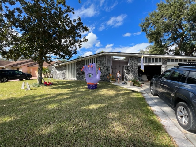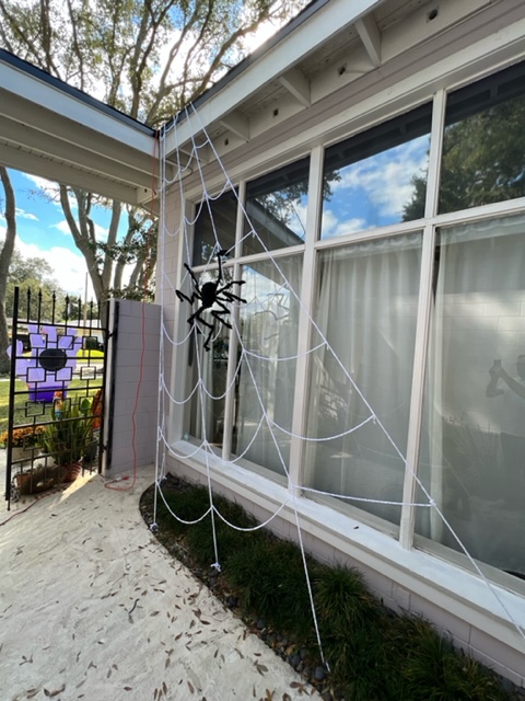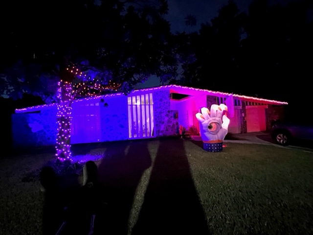 This is my son’s house. We have a black tree on the front porch with red and orange lights and a few things in the yard but not much. I will post that closer to Halloween.