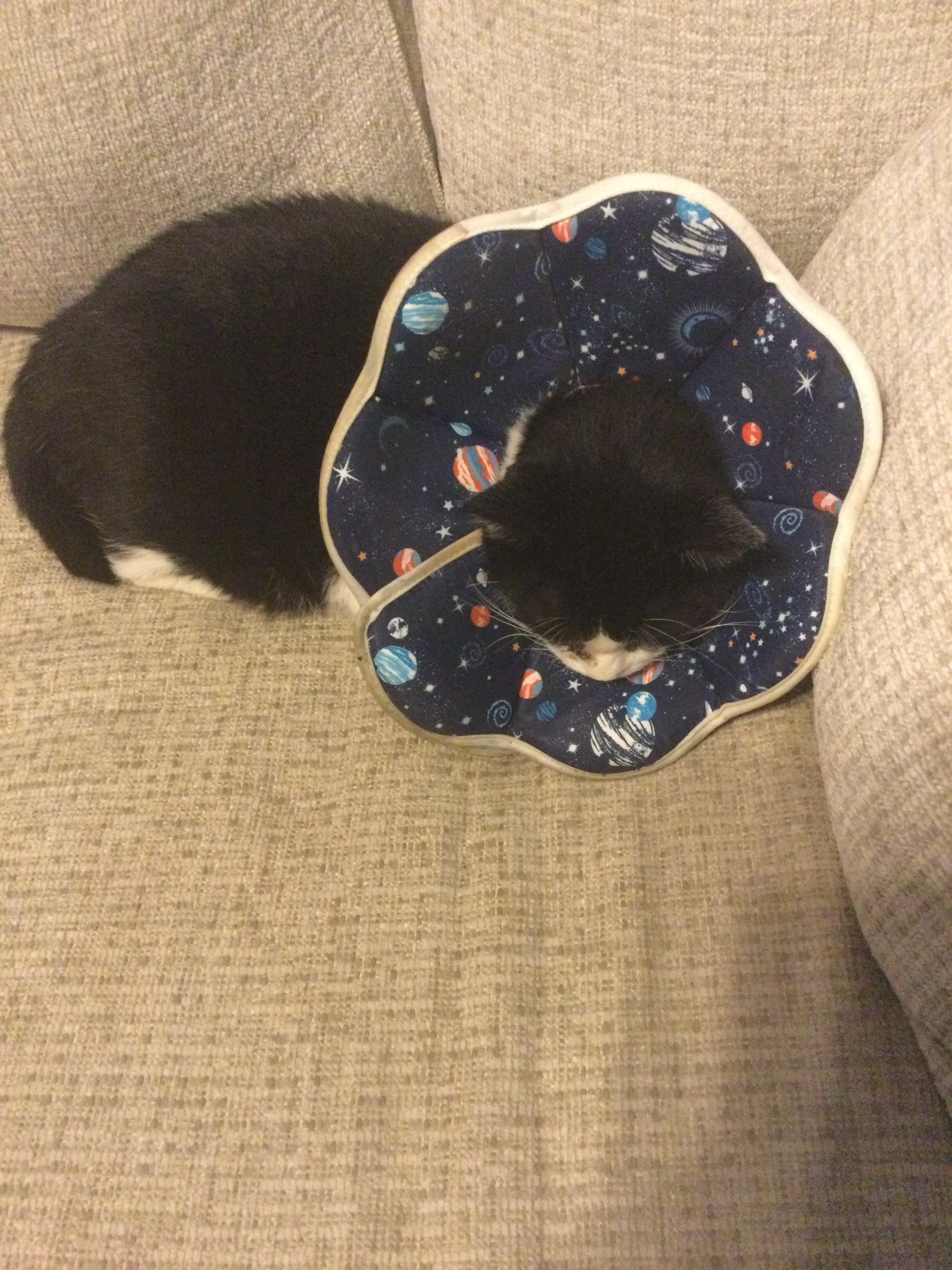 We had to buy him another one as the plastic one was so uncomfortable and he couldn’t eat with it. Got an inflatable one that he immediately removed twice. So, got this one and it is velcro and holding. but it’s getting dirty with him dragging it. He looks like a stegosaurus. LOL! We go back Saturday to hopefully get the stitches out – then he’s free! He is hating not being able to groom. Licks the cone. Poor thing.