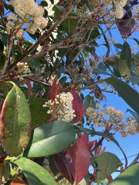 It’s called a ligustrum. It blooms in the spring- This one still has some of the fall leaves on and hasn’t fully bloomed yet. I took this pic on my walk back from the courthouse. Looking up into the tree. I liked the two seasons on one tree look. The blooms smell really kind of a sickly-sweet and can be overpowering when in full bloom, but they are pretty.