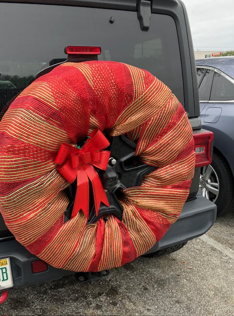 Wow, whoever did that took some time winding those ribbons through that wheel. I hope they don’t get a flat until after Christmas, at the very soonest! (Ummm, that’s not your SUV is it? If it is, props for the inventive wreath.)