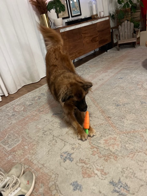 hahaha. That is the GrandDog, Miss Primm. She is playing with the squeaky carrot toy I sent her for Easter. Hobbes has no idea. 🙂